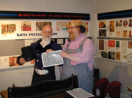 Terry, in the garb of a Victorian postmaster, and Bernard (a.k.a. The Cunning Artificer) display a sheet of as-yet-unperforated "Patrician 1 Penny Black" stamps. Note Bernard's paper hat of the sort that printers once made up of scrap paper every morning before starting work.