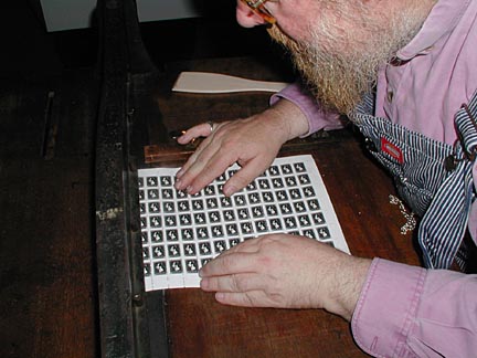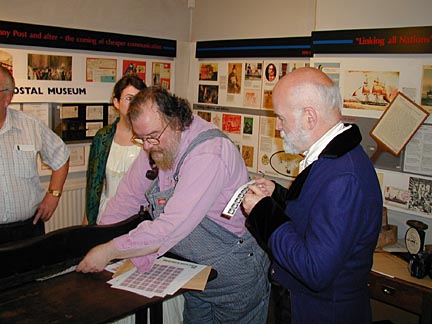 Bernard feeds a sheet of stamps through a vintage perforator at the Bath (UK) Postal Museum. This machine, the last ever "lineal perforator," dates from Victorian times.